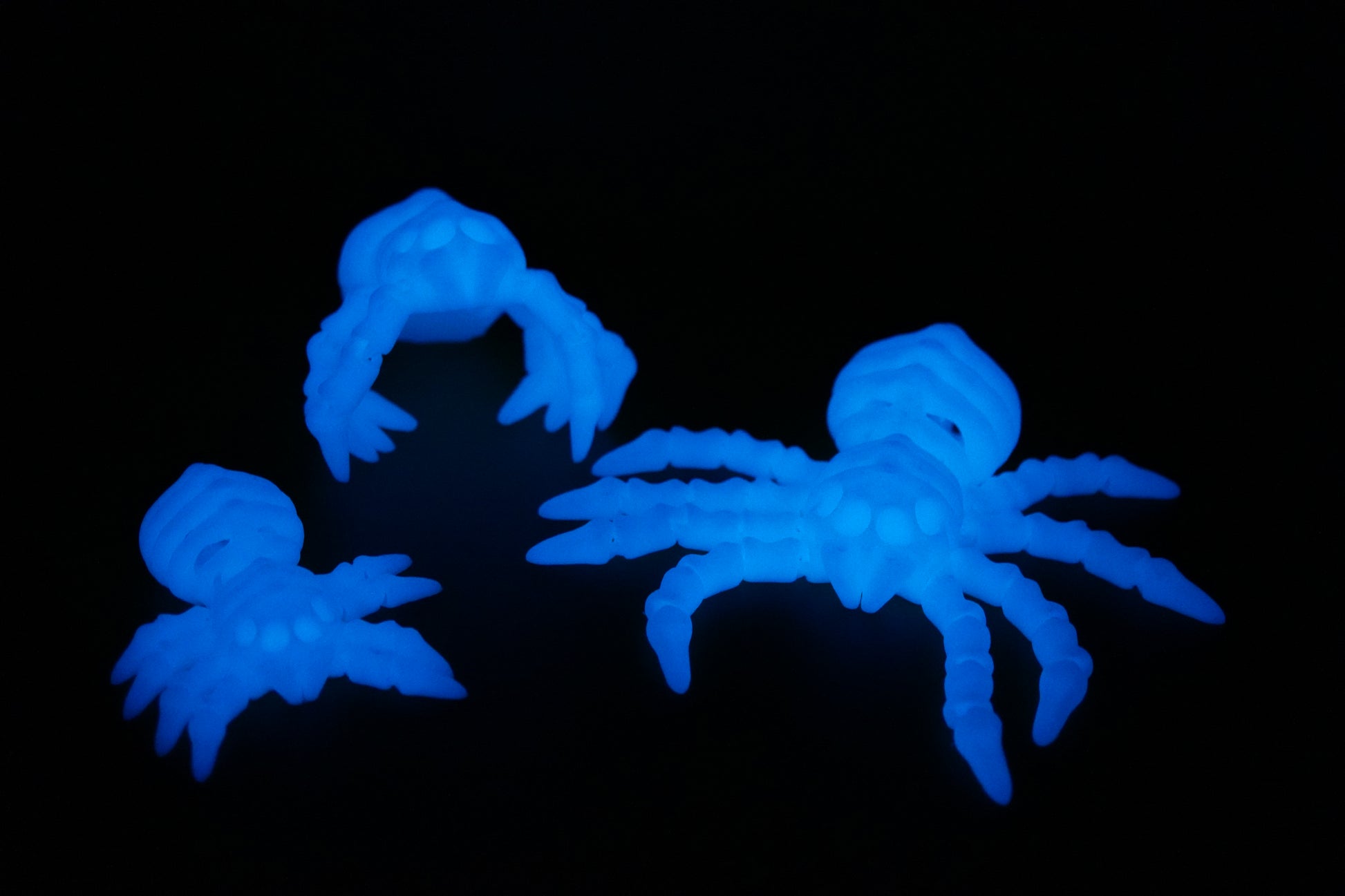 Dale un toque espeluznante a tu decoración con este set de 3 esqueletos de arañas articulado en 3D, brilla en la oscuridad en dos tonos azul y verde. Emite luz después de un absorbente de energía luminosa, especialmente de fuentes como luz UV.