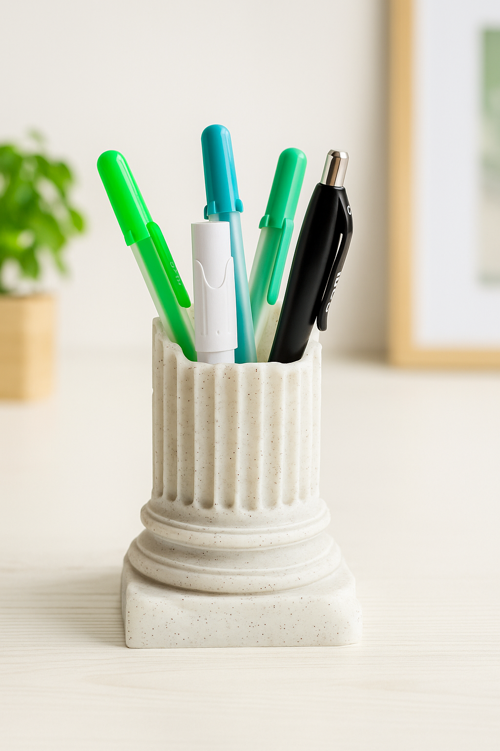 Lapicera con diseño inspirado en una columna clásica, elaborada con un acabado tipo mármol que evoca elegancia y atemporalidad. Su textura pulida y detalles acanalados la convierten en una pieza funcional y decorativa a la vez. Ideal para amantes del arte, la arquitectura y la cultura, esta lapicera aporta un toque sofisticado al escritorio, combinando estética clásica con utilidad moderna.