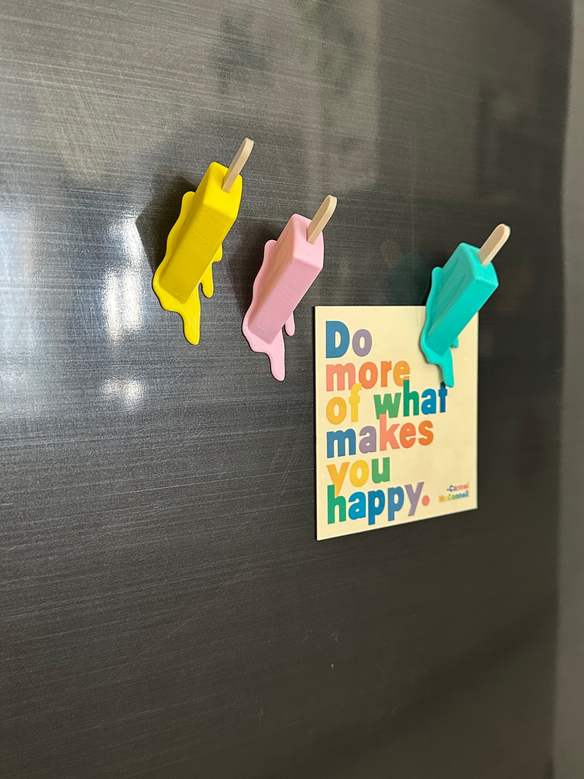 Dale un toque dulce y veraniego a tu refri con este set de 3 imánes en forma de paleta helada . Con un diseño realista de efecto semi derretido y disponible en varios colores que simulan distintos sabores, es perfecto para decorar y sostener notas o fotos en cualquier superficie metálica. Un accesorio divertido, coleccionable y lleno de frescura para tu cocina.