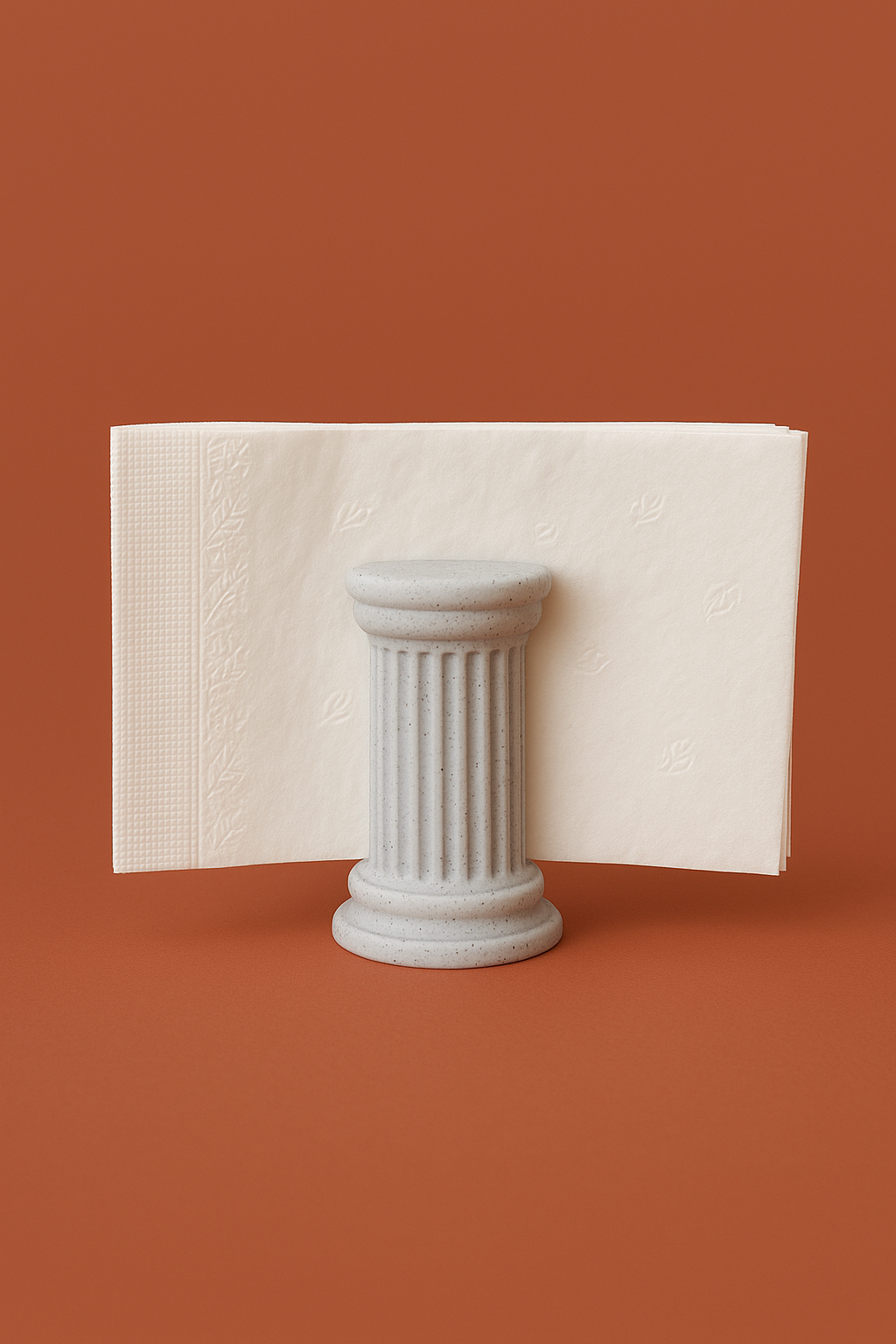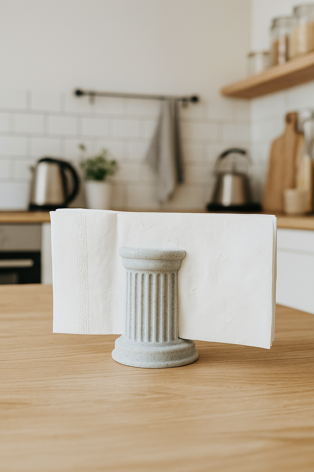 Servilletero con forma de columna romana, diseñado con un elegante acabado tipo mármol que resalta su estilo clásico y refinado. Sus líneas acanaladas y base sólida evocan la majestuosidad de la arquitectura antigua, convirtiéndolo en un detalle distintivo para cualquier mesa.